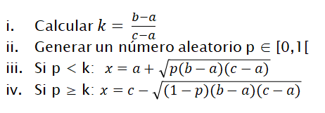 Se comienza calculando un número k que representa la posición relativa del punto b (valor esperado) en el intervalo [a,c], por lo cual b pertenecerá al intervalo [0,1]. Luego se genera un valor aleatorio p que también estará entre [o,1[ y se verifica si está antes o después del valor esperado. Si p es menor que k, el valor aleatorio se sitúa a la derecha de a y como función de p. Si p es mayor que k, el valor aleatorio se sitúa a la izquierda de c y como función de (1-p).
