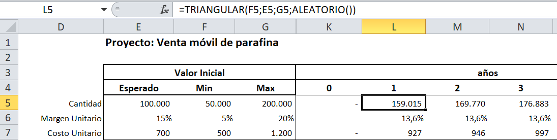 En la planilla de ejemplo vemos un posible uso de la función recién creada, para proyectar valores inciertos de cantidad, costo y margen unitario. Se dispone en las celdas F5 y G5 de los valores máximos y mínimos respectivamente, mientras que en E5 se encuentra el valor esperado. El cuarto parámetro es el valor aleatorio entre [0,1[ que lo generamos mediante la función ALEATORIO() de Excel. La ventaja de hacerlo de esta manera es que generaremos nuevos valores aleatorios cada vez que presionemos F9.